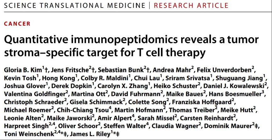 Kim GB, Fritsche J, Bunk S, et al. Quantitative immunopeptidomics reveals a tumor stroma-specific target for T cell therapy. Sci Transl Med. 2022;14(660):eabo6135.