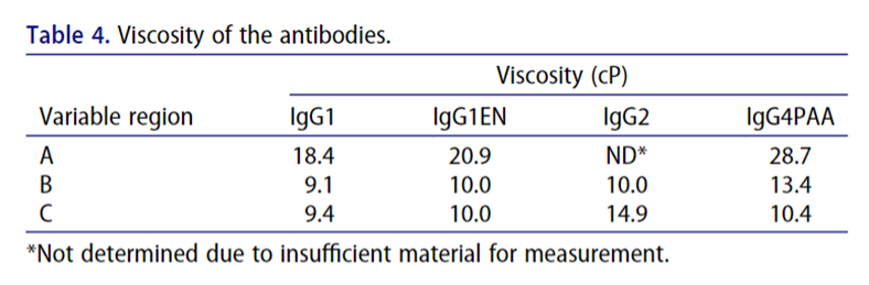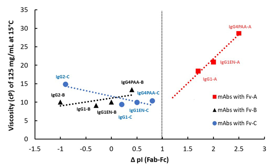 o 搭配 Fv C 时:粘度排序为IgG2 > IgG4PAA ≈ IgG1EN ≈ IgG1,可能因 Fv C 的高疏水性掩盖了亚型电荷效应,而 IgG2 的二硫键异构体引发分子间交联,导致粘度升高。