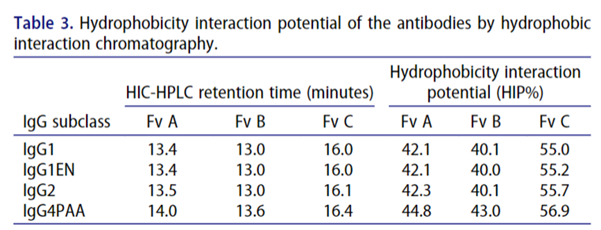 疏水性过强的抗体会在高浓度储存中发生聚集,导致药效下降或引发免疫反应。研究通过疏水相互作用色谱(HIC)检测保留时间及疏水相互作用潜力(HIP%),发现(表3):