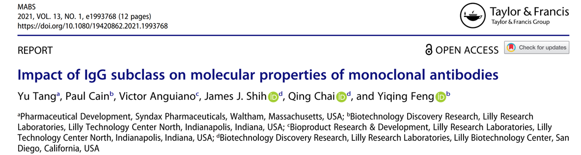 Tang, Y., Cain, P., Anguiano, V., Shih, J. J., Chai, Q., & Feng, Y. (2021). Impact of IgG subclass on molecular properties of monoclonal antibodies. mAbs, 13(1), 1993768. https://doi.org/10.1080/19420862.2021.1993768