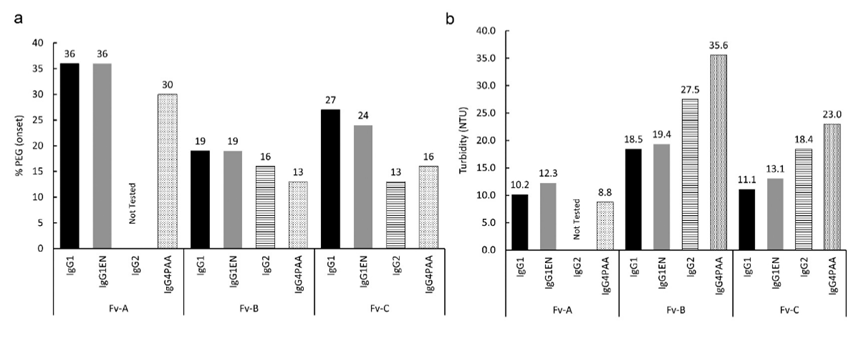 图4 通过PEG诱导沉淀法(a)和微量浊度法(b)评估抗体的溶解度