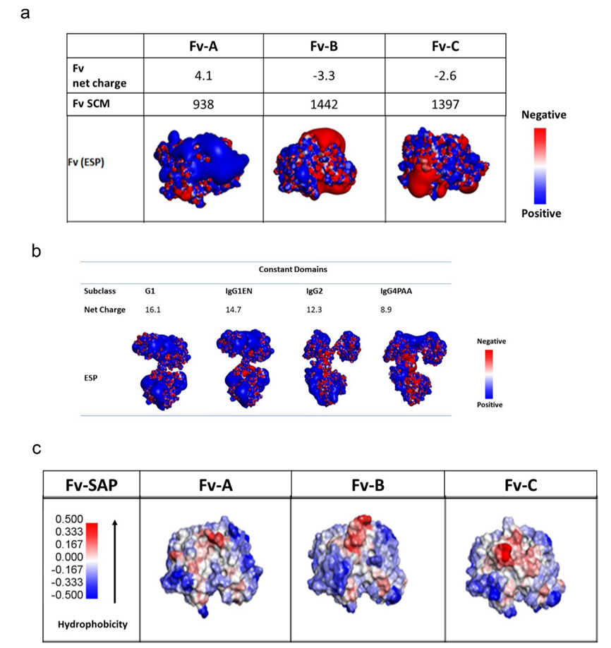 可变区:Fv A 表面以正电为主;Fv B/C 则在 CDR 区存在显著负电簇;