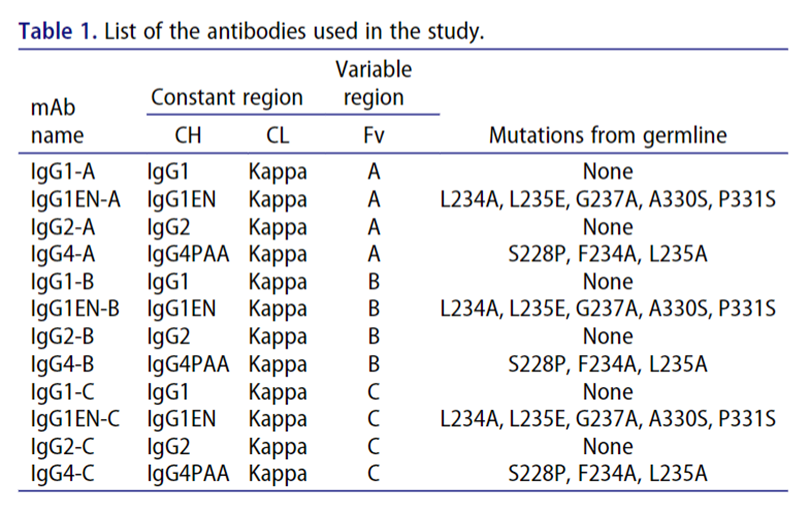 抗体的可变区序列差异极大,因此想要分析不同IgG亚型对抗体特性的影响,需要排除可变区差异的干扰。为解决这一问题,研究团队构建了“固定可变区+可变亚型”的12种抗体(表1)。具体来说: