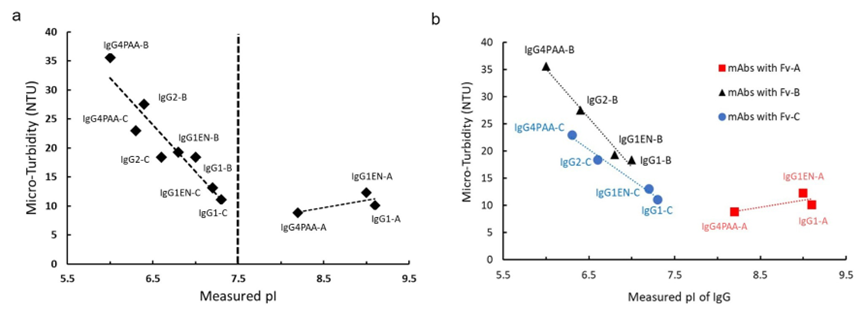 亚型的条件下影响:亚型对溶解度的调控依赖抗体整体 pI:在pH6.0的缓冲液中,当pI<7.5 时,排序为IgG1≈IgG1EN > IgG2 > IgG4PAA;pI>7.5(如Fv A)时,亚型差异消失(浊度低于检测下限)。