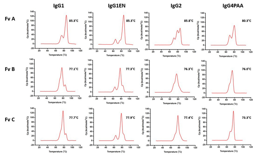 热稳定性直接影响抗体的储存期限,通常用通过差示扫描量热法(DSC)检测解折叠温度(Tm)评估,Tm越低,抗体越容易在储存中降解,研究结果(图1)显示: