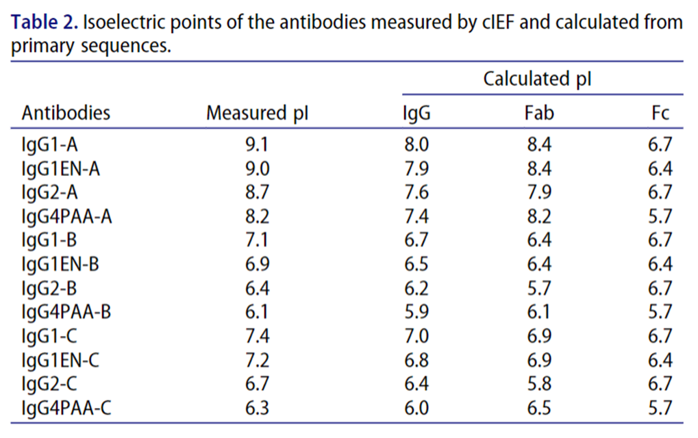 等电点是抗体制剂 pH 设计的核心依据 —— 若制剂 pH 接近抗体 pI,易引发分子聚集或沉淀。如表2所示,本研究发现: