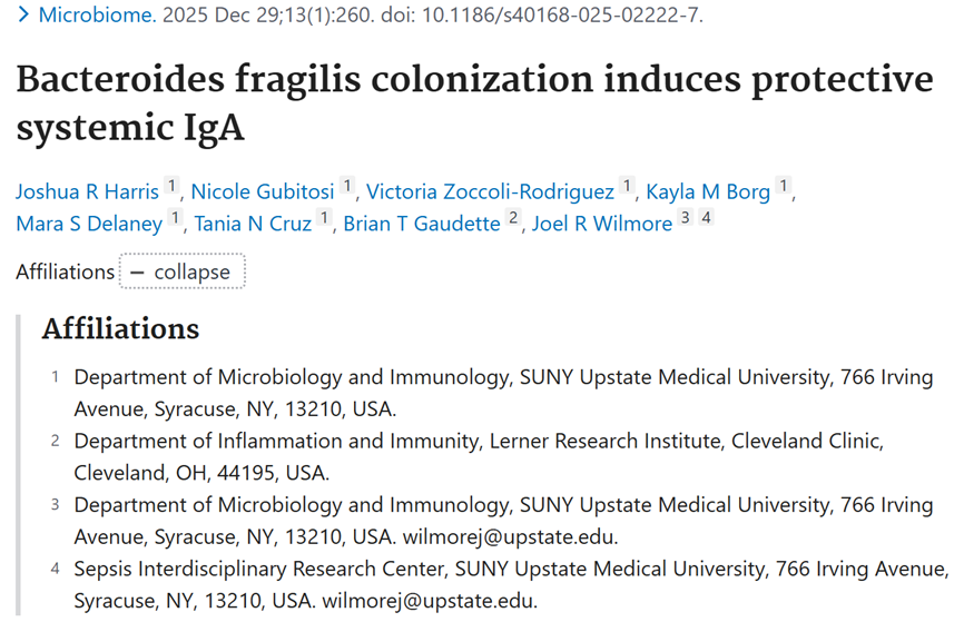 Harris JR, Gubitosi N, Zoccoli-Rodriguez V, et al. Bacteroides fragilis colonization induces protective systemic IgA. Microbiome. 2025;13(1):260.